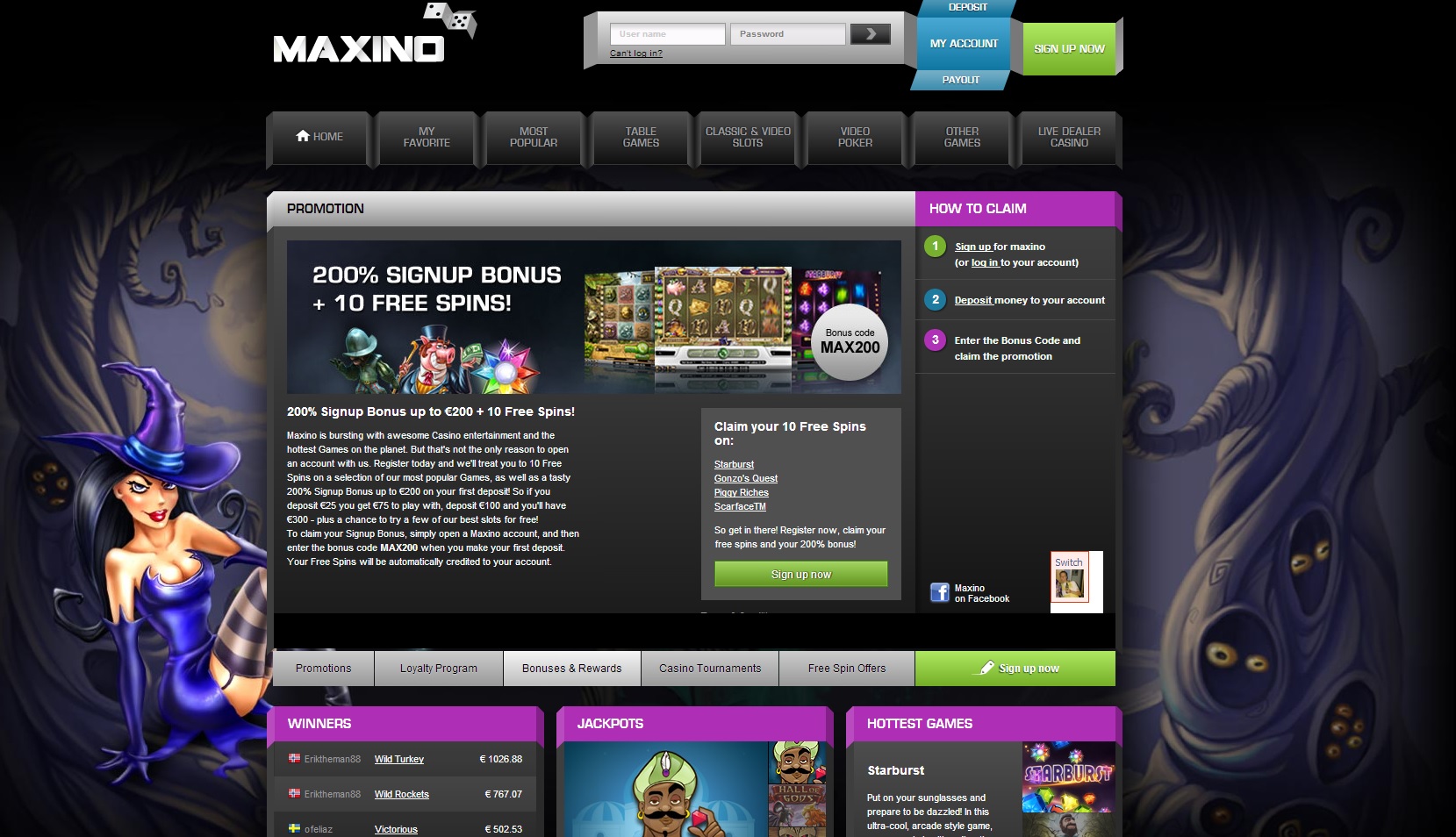 Maxino Casino 200% Signup Bonus up to €200 + 10 Free Spins